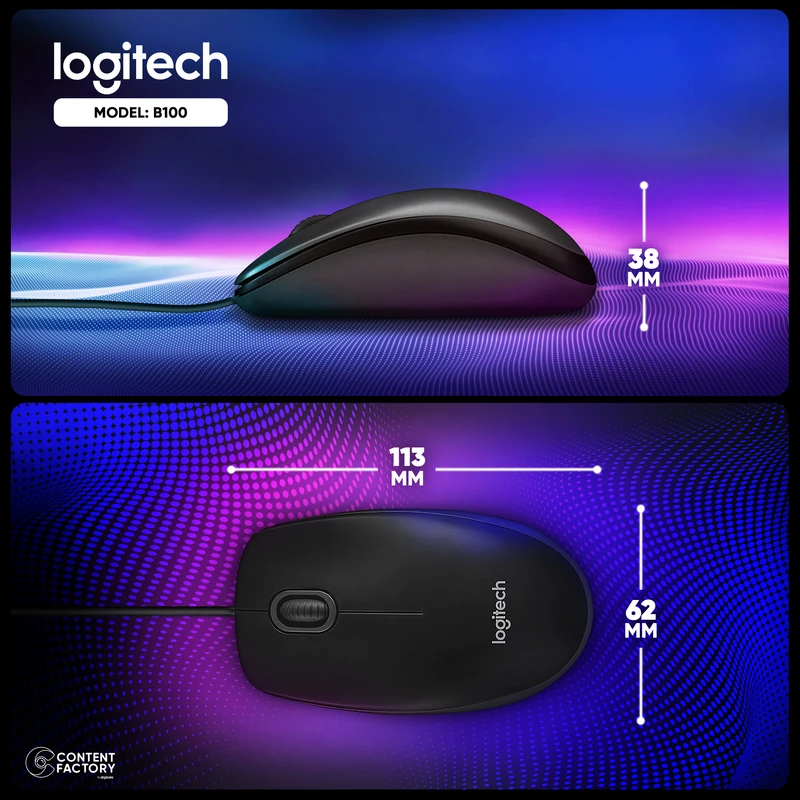 ماوس با سیم لاجیتک مدل Logitech B100 Wired Mouse دارای ابعاد ۱۱.۱ × ۶.۱ × ۳.۸ سانتی‌متر و وزنی حدود ۱۰۵ گرم است. این ابعاد کوچک و وزن سبک آن، امکان حمل و نقل آسان را فراهم می‌کند و می‌توانید آن را به راحتی در کیف دستی خود قرار دهید. شرکت لاجیتک این ماوس را به گونه‌ای طراحی کرده است که به راحتی در دست قرار گیرد و هنگام استفاده بلندمدت از آن، احساس خستگی را به کاربر انتقال ندهد. همچنین برای ساخت بدنه این ماوس از پلاستیک با کیفیت استفاده شده است تا در برابر ضربه‌ها و صدمات مقاومت خوبی ارائه دهد. ماوس B100 از حسگر اپتیکال برخوردار است که محدوده دقت آن بین ۸۰۰ تا ۱۶۰۰ dpi (نقطه در هر اینچ) قرار دارد. با اینکه دقت پیشفرض آن ۸۰۰ dpi است، اما می‌توانید دقت را تا ۱۶۰۰ dpi تنظیم کنید. با استفاده از سنسور اپتیکال، ماوس B100 به راحتی قادر است در میان صفحات مختلف وب و اسناد خود جستجو کند. دقت بالا و عملکرد قابل اعتماد این ماوس، به شما امکان می‌دهد با دقت بالا در محتواها و اطلاعات مورد نظرتان حرکت کنید. ماوس B100 با دقت و کاربری بالا، تجربه کار با کامپیوتر را برای شما لذت بخش می‌کند.