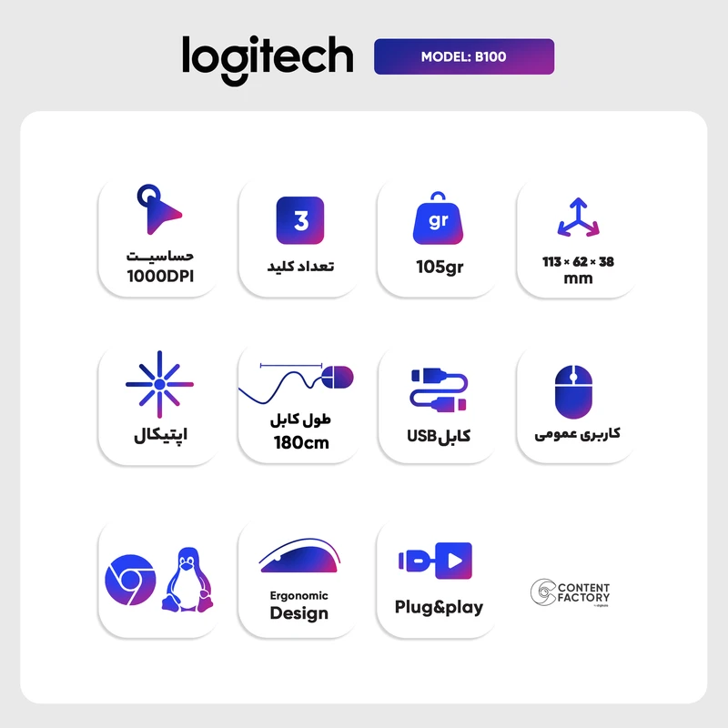 ماوس با سیم لاجیتک مدل Logitech B100 Wired Mouse یک محصول ساده و کارآمد است که برای کارهای روزمره و جستجو در صفحات وب مناسب است. این ماوس دارای ابعاد کوچک و وزن سبک است که حمل و نقل آن را آسان می‌کند. این ماوس از طراحی ارگونومیک و مقاوم برخوردار است که راحتی و دوام آن را افزایش می‌دهد. این ماوس از حسگر اپتیکال با دقت قابل تنظیم استفاده می‌کند که کنترل دقیق و روان مکان‌نما را ممکن می‌سازد. این ماوس از قابلیت Plug and Play پشتیبانی می‌کند که نصب و استفاده از آن را بسیار سریع و آسان می‌کند. این ماوس با سیستم‌های عامل مختلف سازگار است و از طریق کابل USB به دستگاه متصل می‌شود