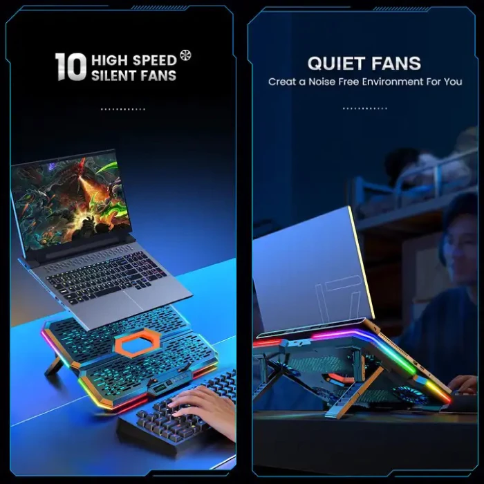 کول‌پد کول کلد مدل K39 یک خنک کننده لپ‌تاپ با ۱۰ فن است که می‌تواند به خوبی لپ‌تاپ شما را خنک کند. فن های کم صدا اما با سرعت بالای این استند خنک کننده به سرعت گرمای لپ تاپ شما را از بین می برد. این خنک کننده لپ تاپ دارای نورپردازی رنگی است که با یک دکمه قابل تغییر است که این محیطی خنک و عالی را برای بازی و کار ایجاد می‌کند.این خنک کننده لپ‌تاپ ارگونومیک دارای ارتفاع قابل تنظیم به ۷ ارتفاع مختلف است. همچنین با یک ضد لغزش ساخته شده است که به طور موثر از سر خوردن لپ‌تاپ جلوگیری می‌کند. ارتفاع قابل تنظیم برای پاسخگویی به نیازهای مختلف هنگام کار یا بازی، و در کل برای یک دید خوب و طبیعی است. پایه خنک کننده لپتاپ کول کلد مدل K39 دو پورت USB دارد. یکی USB تایپ A و دیگری USB تایپ C که امکان اتصال دستگاه‌های USB بیشتر را فراهم می‌کند. ضمناً قابلیت plug and play دارد و به آسانی می‌توانید از آن استفاده کنید.